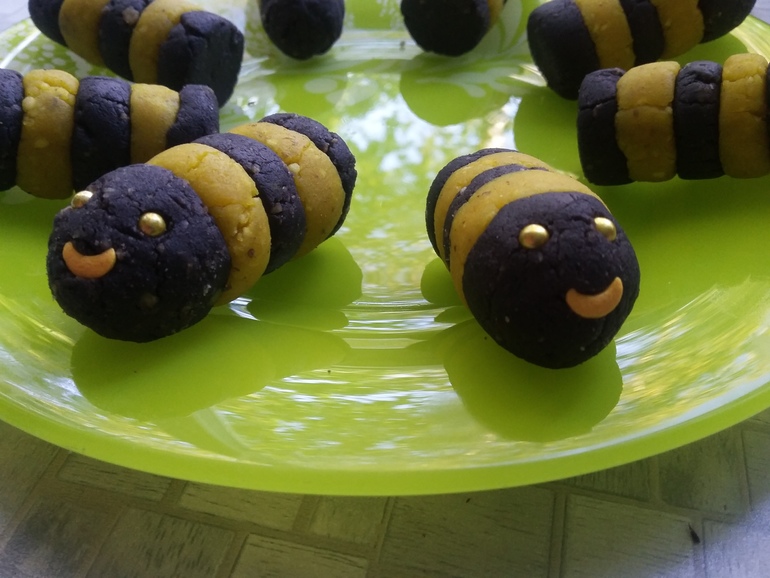 Сложить тело пчелки (я немного прикатывала рукой цилиндры). Вставить из кондитерских присыпок глазки и ротик (ну захотелось мне сделать улыбки):