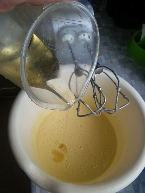 Перемешать миксером и влить тонкой струйкой 65 мл растительного масла без запаха: