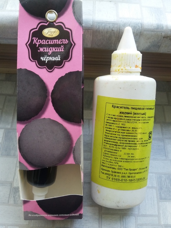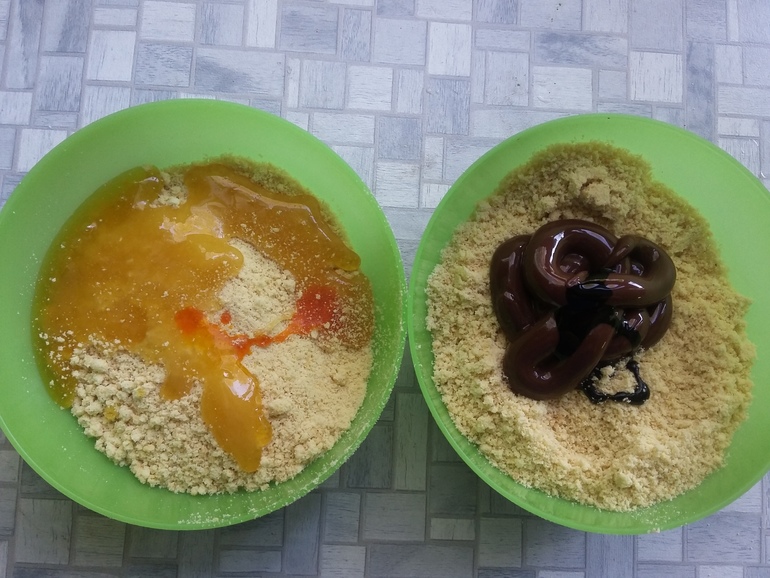 Разделить на 2 части. В первую добавить мед, сгущенку и желтый пищевой краситель; во вторую сгущеное какао, немного воды и черный краситель: