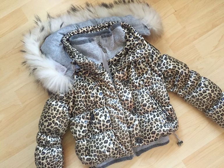 Размер 92, но зависит от ребёнка, можно и до 100 размера носить. Курточка смотрится дорого и элегантненько. Расцветка леопард, на капюшоне из страз логотип ,,M" на поясе бляшка в стразах, стразики все на месте. Цвет в живую намного ярче , красивее и насыщенней.2800