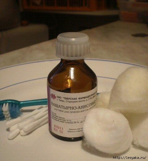 1. Возьмите ватную палочку и смочите ее в нашатырно-анисовом растворе (можно взять анисовую настойку).
