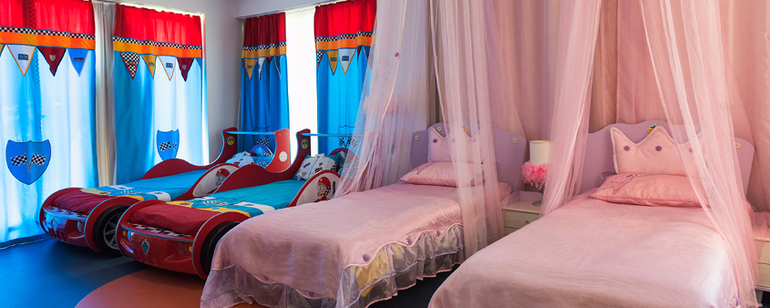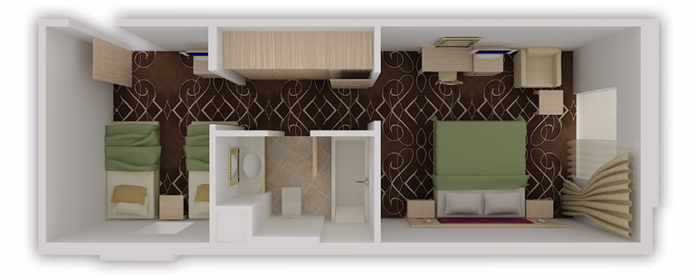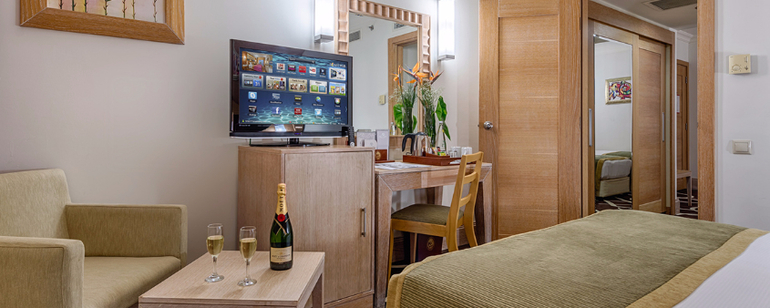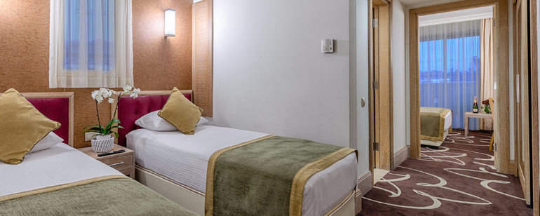 Каждая из них состоит из двух спальных комнат, разделяемых между собой дверью, а так же одной ванны. В комнатах есть фен, сейф, прямой телефон, балкон, телевизор, мини бар и центральный кондиционер, WIFI.