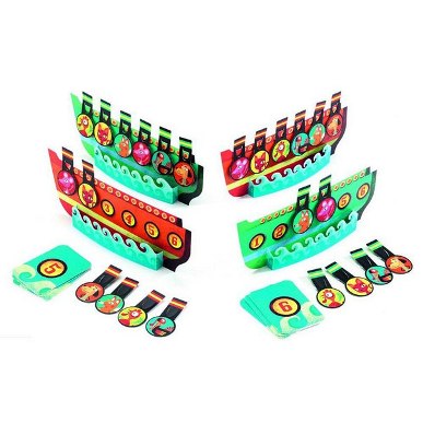 В наборе: 5 деревянных кубиков, 24 карточки звезд и 4 игровых платы. Количество игроков: 2-4 человека.