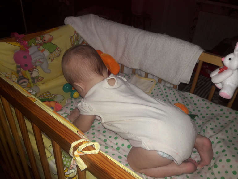 Нам без 3-х дней 6 месяцев)) У нашей малышки появилось новое движение: упирается ручками, становится на коленки, и расскачивается вперёд назад, бывает аж подпрыгивает))Уже неделю так делает и с каждым днём все лучше и лучше у неё получается)) Так забавно) Скоро с кроватки выпрыгнет и побежит)) Так она быстро растёт, наше солнышко😘💞💋