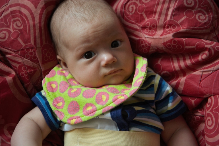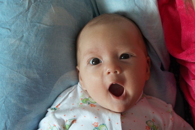 Со звуковыми эффектами. Что-то вроде радостного возгласа. Классно, в общем. Агукает еще много. А я удивляюсь, мне кажется, рановато как-то. Помню, Тёмка начал у меня улыбаться к 3 месяцам. А этот малыш и голову держит с рождения, и улыбаться-гулить стал к месяцу. Не зря так долго в животе сидел. Прокачался. ) Еще нашел свои кулачки. С жадностью обсасывает. ))