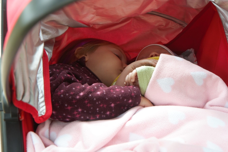 Лянку к обеду обычно клонит в сон. Если она дома, то это выливается в истерику. А если на улице, то уставшая Лянка просто просится в коляску, где засыпает за минуту, обняв плюшевого малыша.