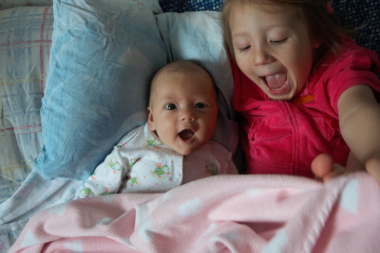 Лянка всё еще довольно много играет с Лесей, но всё чаще тянется к малышу.