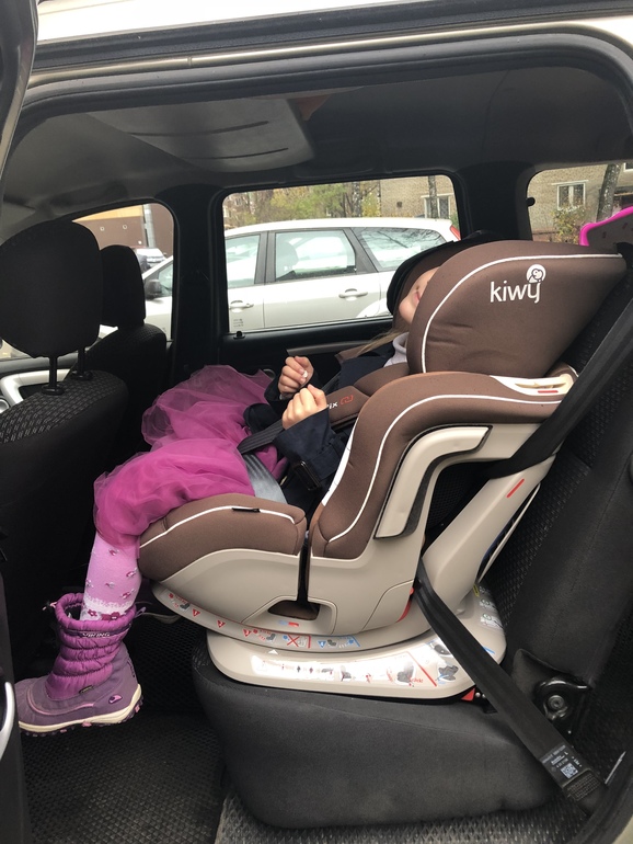 В Лянкином варианте кресло пристегнуто ремнями безопасности и изофиксом. Сама Лянка пристегнута внутренними ремнями автокресла. Лянке 4 года.
