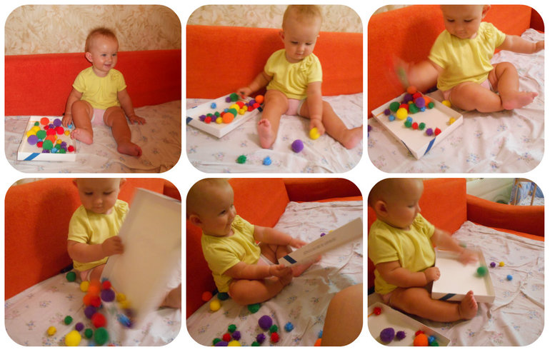 Ну я отвлеклась) как Сонечка играет с этой волшебной коробочкой: Сначала берет несколько помпончиком по-очереди, потом вообще хватает за коробочку и все их дружно высыпает на себя и соответственно вокруг, может вообще играться только коробочкой, потом я подхожу засыпаю все добро обратно в коробку и интерес просыпается вновь