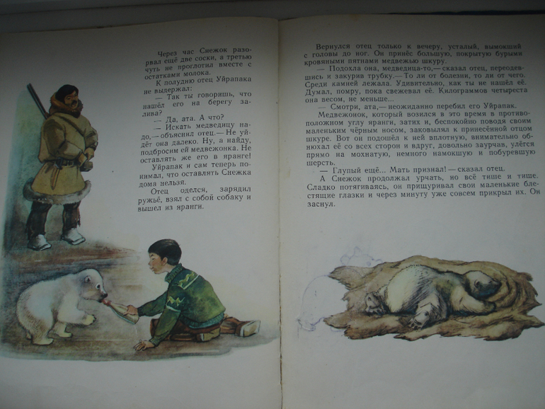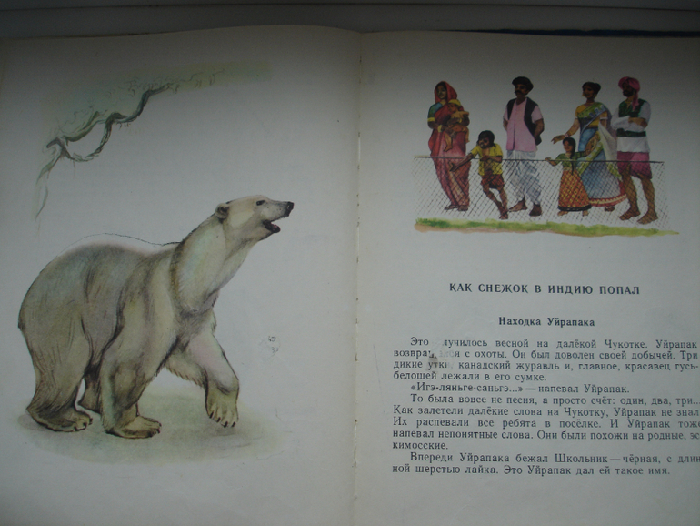 "Как Снежок в Индию попал". Судьба у медвежонка непростая. В самом начале рассказывается, как Снежок появился у людей. Чукотский мальчик пожалел потерявшегося медвежонка и взял домой. Отец решил, что надо разыскать мать и подбросить ей медвежонка, потому что оставить его у себя никак нельзя. Далее по тексту: