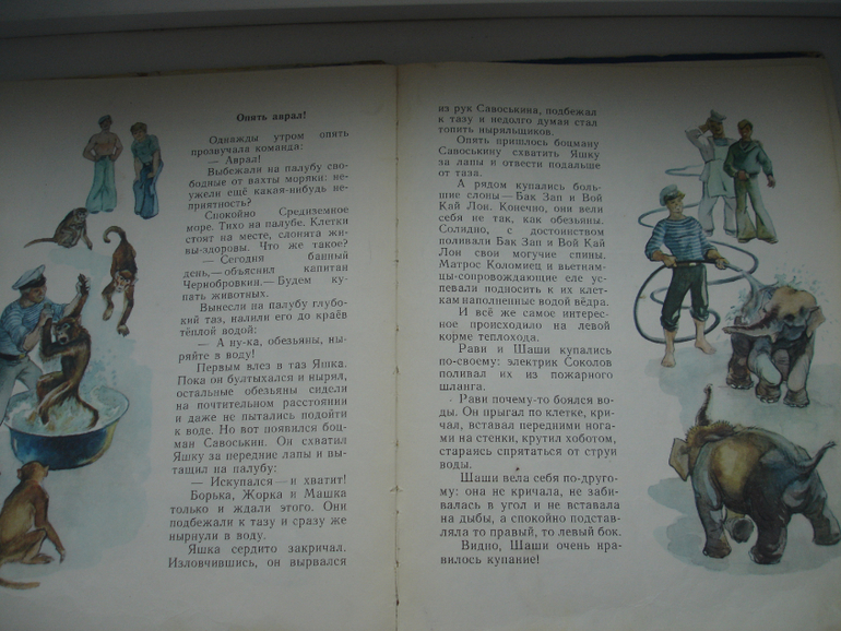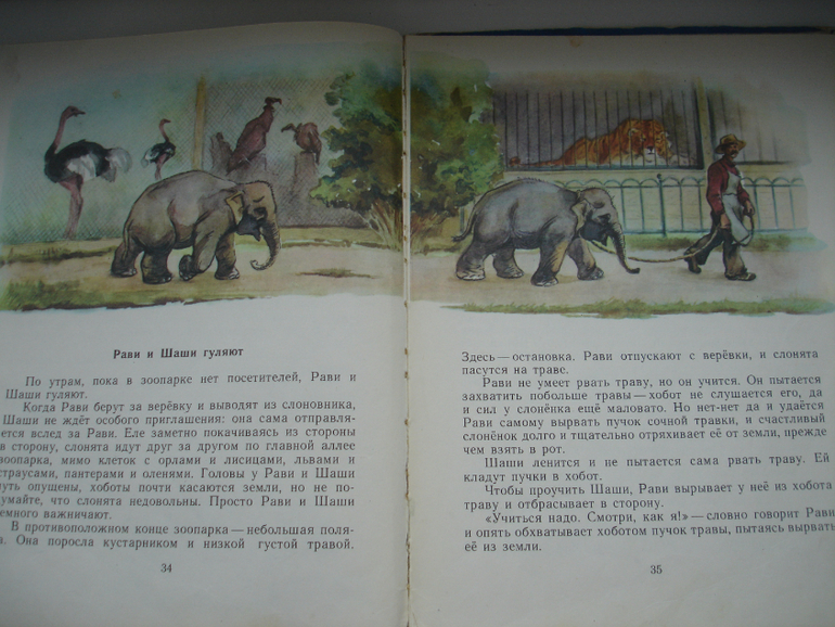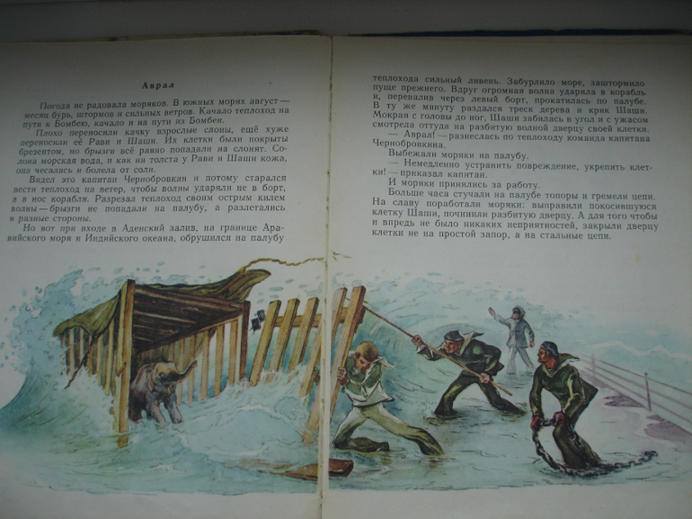 "Рави и Шаши". Особенный интерес повести придаёт не просто то, как живут слонята, а то, в каких условиях оказываются. Легко ли перевозить на теплоходе слонов? С ними много что происходит, например, однажды в бурю волна разрушает дверь клетки Шаши. Даже такие "бытовые" эпизоды как кормление или купание становятся захватывающим из-за того, что всё происходит на борту корабля.