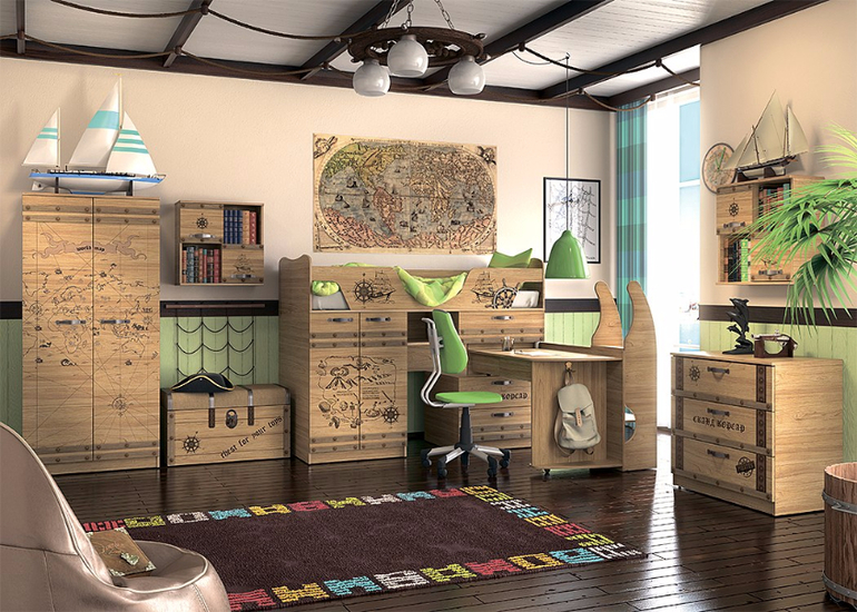 Полностью оборудованная , выполненная из прочных и безопасных материалов в захватывающем стиле морских приключений и открытий, который вдохновит юных исследователей. Оригинальные рисунки на фасадах выполнены с помощью безопасной для здоровья ультрафиолетовой печати, которая прослужит долго и не потеряет вид, легко перенося даже влажную уборку.