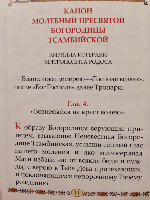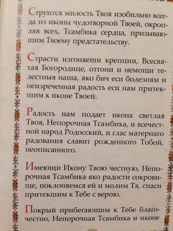 Имея источник даров Твоих, икону Твою, остров Родос величает Тя, Богородица Цамбика, изумляясь твоих чудес, наслаждается, и со Ангелом вопиет Тебе: Радуйся, Дево Благодатная, спасение рода христианского.