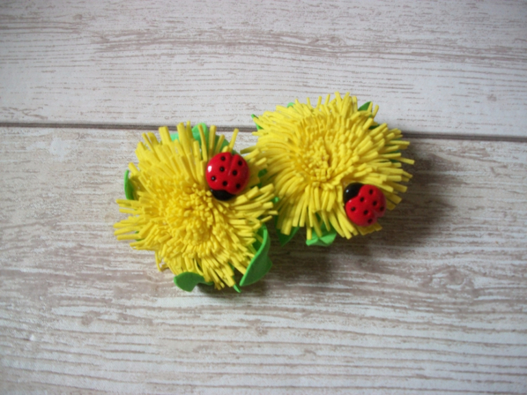 Аксессуар для волос из фоамирана, в виде цветка одуванчика с "божьей коровкой" . Украшение мягкое и нежное, в тоже время практичное в использовании, не боится влаги, не деформируется. Диаметр около 4 см, можно закрепить на резинку или зажим. Яркое украшение для девочки, напоминающее о теплом лете. Цена указана за пару