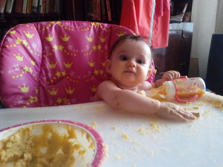 Алисенок уже очень хорошо ползает и встает на ножки держась за что то. Стала еще любопытней, все ей надо посмотреть, потрогать и на вкус попробовать. Очень радуется когда мы ее берем на руки или целуем. Очень любит играть моя маленькая хохотушка. Так внимательно слушает нас и отвечает. Кушаем мы офощные пюрешки с мясом, каши, детские творожки, фрукты и детское печенько, ну и молочко мамино еще пьем. А еще мы уже месяц катаемся на новой колясочке и сидим в новом стульчике для кормления. Все хотела отзыв написать, но никак не найду времени на это.