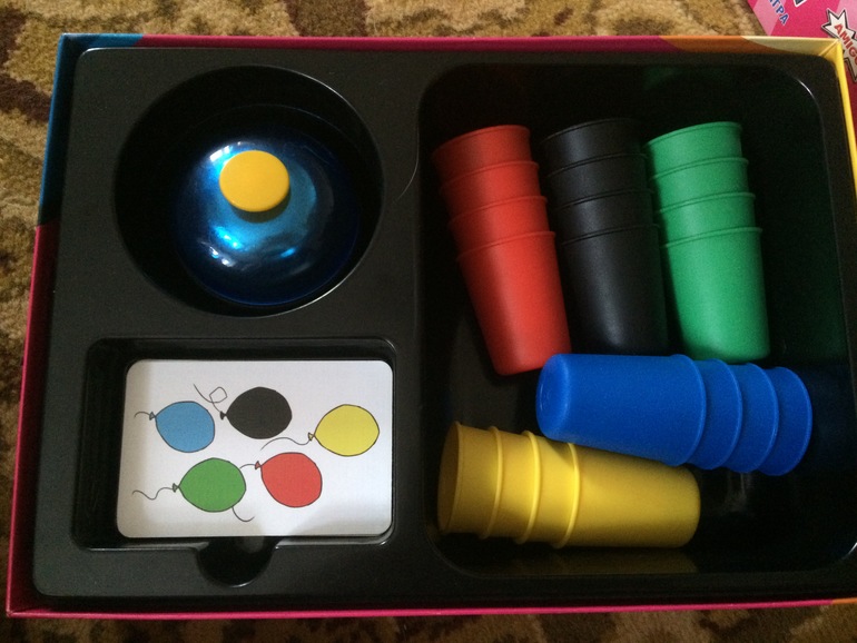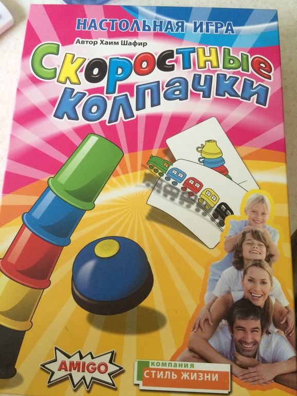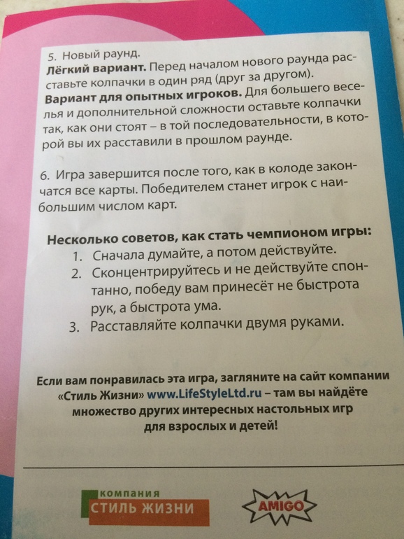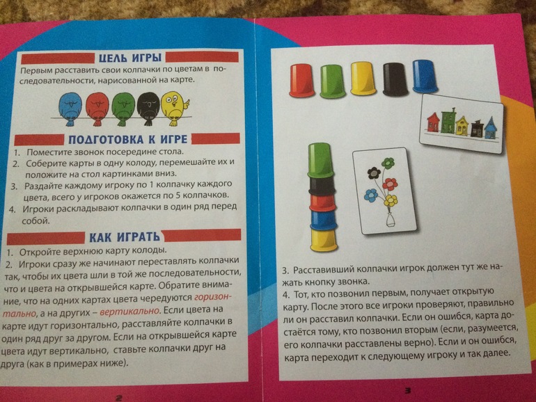 В общем, для тех, кто не любит читать правила на скане, объясняю: достается из 24 картинок одна, каждый игрок имеет набор стаканчиков 5-ти цветов, и кто скорее расставит стаканчики слева-направо или снизу-вверх быстрее, кто первый составил, звенит в звонок! (ох, как дети это любят!!!!!!!!!!!) проверяем - если верно, игрок получается эту карту - у кого больше карт - тот и победил)))