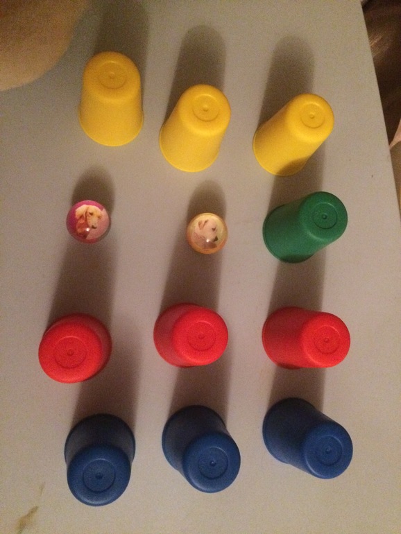 так как мячики одинаковые - то игрок забирает их оба, переворачивая стаканчики. Таким образом, играют, пока не заберутся все мячики, у кого больше - то и победил) У меня двойная задача в этой игре - запомнить и НЕ отгадать....потому что реакция на проигрыш у нас пока ужасна....(как бы деликатно они ни была преподнесена!)