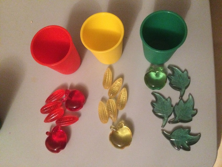 Можно сортировать любые цветные детальки мозаики, которые у вас есть (у нас Plan Toys)