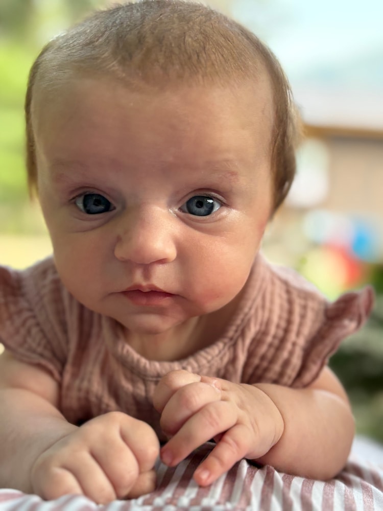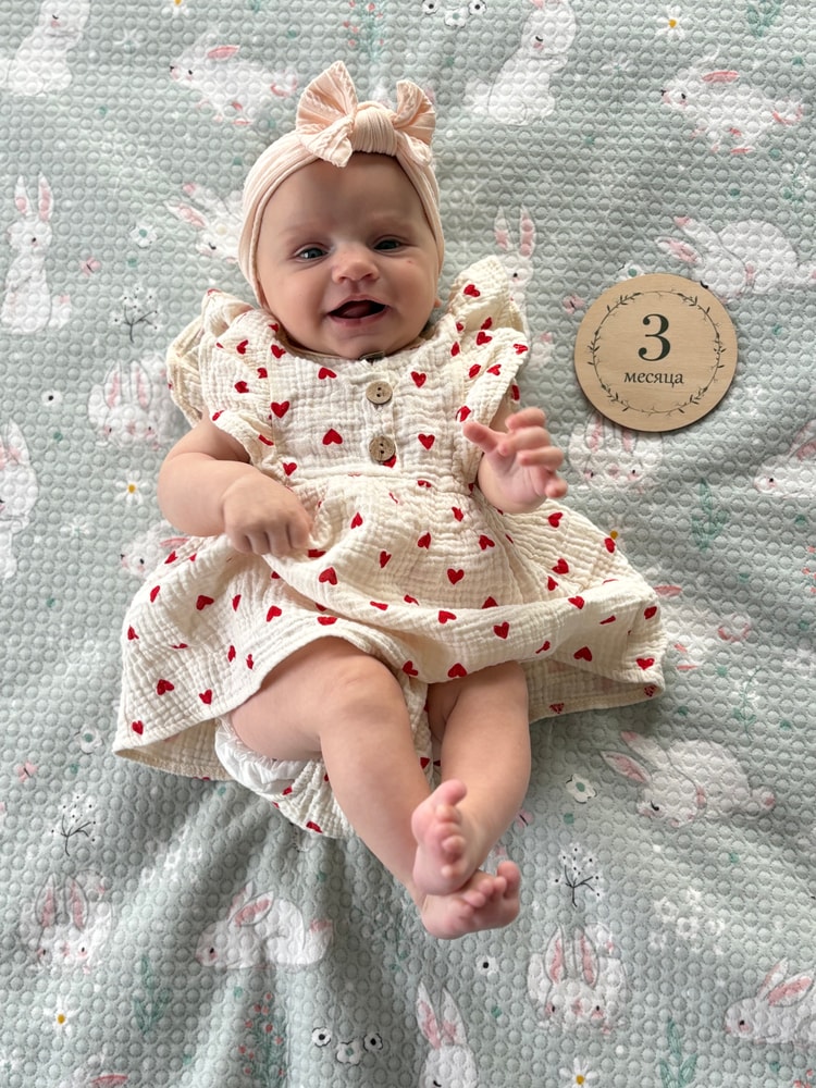 Умеет переворачиваться на бок, сосать кулаки и теребить ухо, интересуется игрушками . Спит хорошо , в ночной сон уходит в 21 и ест в 5 утра , потом спит до 8. Днем когда как )