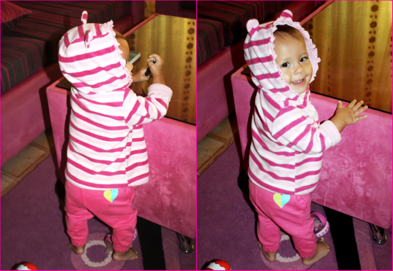 Начала топать по паре шажочков сама, но боится и приседает, более уверенно ходит только между нами с папой ) Туда-сюда ходит между нами, постепенно садимся подальше друг от друга, а она такая счастливая, смеётся, идёт пошатываясь, а когда подходит ближе начинает прям бежать и падает к нам в руки
