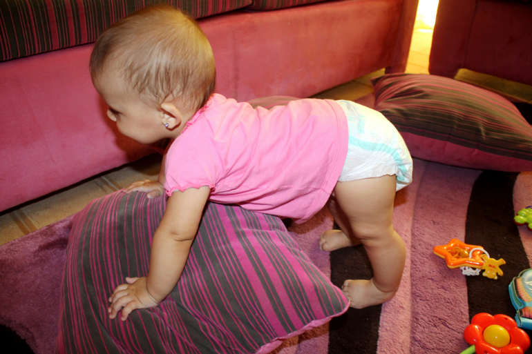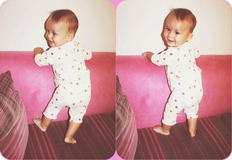Научилась залазить на диван если внизу есть подушка, т.к. он у нас высокий, но на диване же обязательно нужно встать и походить! ))) Глаз да глаз! ) Очень активная! На месте не сидит