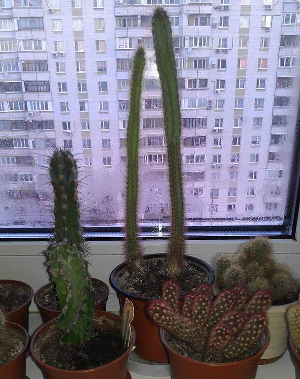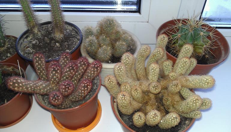 Два кактуса решила оставить, кругленький с желтыми колючками и маленькая маллилярия (на фото они рядом в первом ряду)