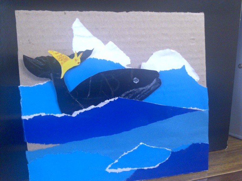Митя рвал из цветной бумаги волны и айсберги, создал море. Затем помог улитке надежно закрепиться на хвосте у кита, приклеив ее, и пустил кита в свободное плавание (волны я промазала клеем не полностью, так что кит мог беспрепятственно перемещаться по морским просторам).