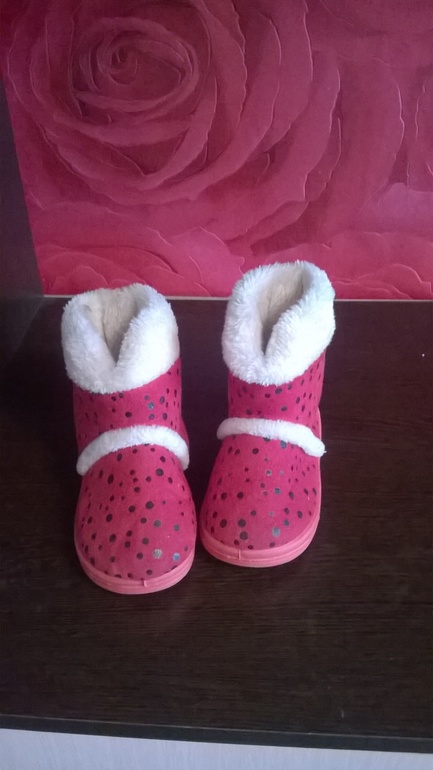 Сапожки утепленные, внутри иск. мех, снаружи мягкий типа велюр что-ли. Подошва резиновая. Демисезон на сухую погоду или как теплые тапочки дома. По стельке 16 см, хорошо на ножку до 15 с небольшим. Цена 550 р.
