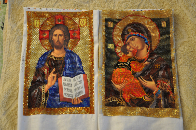 Вышилась у меня венчальная пара от фирмы Кроше. Конечно, набора такого у производителя нет. Это две иконы: Господь Вседержитель и Богородица Владимирская, но я задумала их именно как венчальную пару.