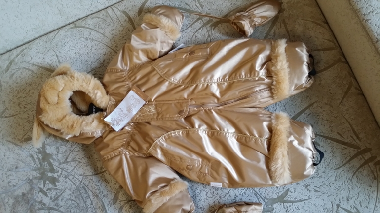 Комбинезон утеплен толстым слоем "KERRYFILL" (это утеплитель нового поколения), велюровая подкладка, в ручках и ножках для удобства подкладка из полиэстера. Модель застегивается на две молнии, на грудке карман и аппликация, на спинке по талии резинка. Капюшон с помпоном на резинке, отстегивается, на велюровой подкладке и с утеплителем, опушка искусственный мех.
