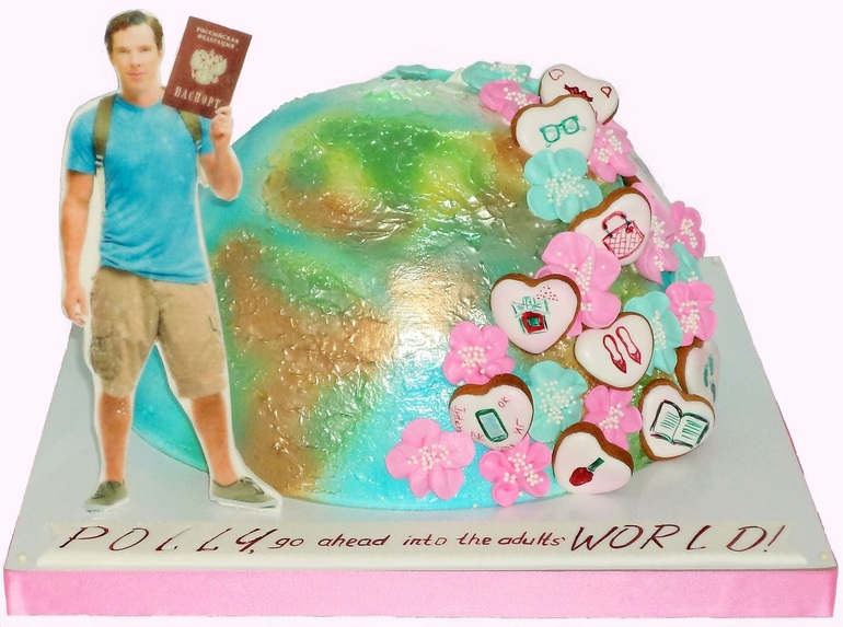Это мой уже 5 глобус. Заказчица очень хотела "Девочковый" глобус, любимого актера и паспорт. Родился такой торт. Оформление белковый заварной, аэрограф.