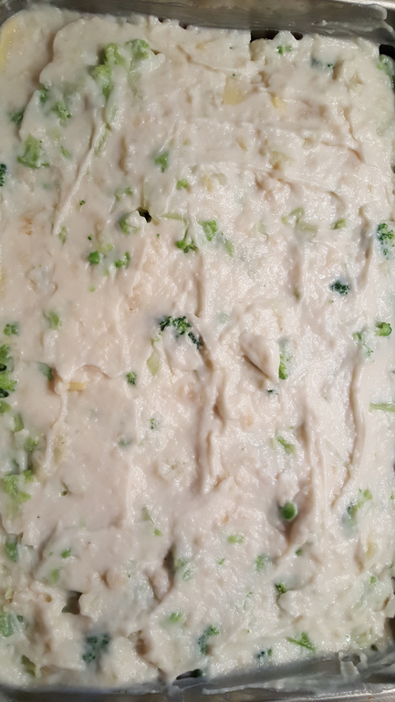 Соуса бешамель готового дома не оказалось... поэтому сделала его сама. 100 гр. сливочного масла, 100 гр. муки и около 1л молока. Залила им уже выложенные на лист брокколи, картошку и мясо