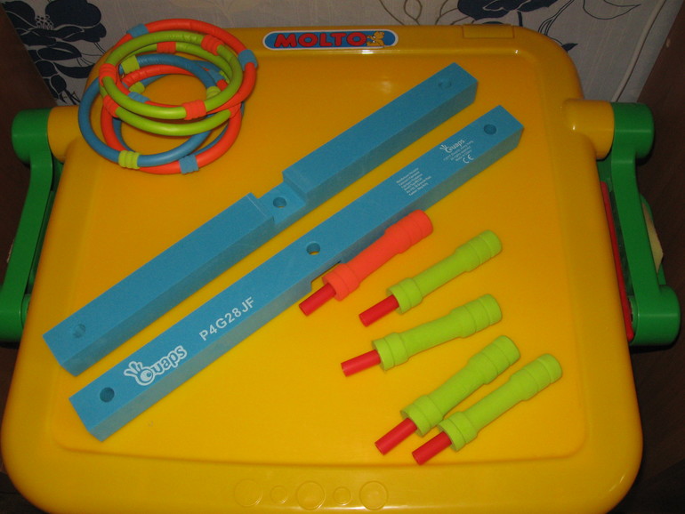 Правила игры всем известны - с определенного расстояния набросить кольца на столбики. При этом шум создается минимальный, т.к. все детали мягкие, это большой плюс при игре дома. Еще у набора очень приятная цветовая гамма и приятные на ощупь материалы, особенно столбики - как бархатные. Набор легко собирать и разбирать, он не займет много места и его можно брать с собой. Вот только сумки никакой не предусмотрено, набор был в обычной упаковке - снизу картон, сверху запаян прозрачным материалом. Это, пожалуй, единственный минус. В остальном, очень приятное впечатление. Кстати, там даже была инструкция на обороте упаковки, как правильно играть и сколько очков набирает участник, но я думаю, правила интереснее придумывать самому.