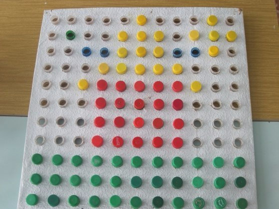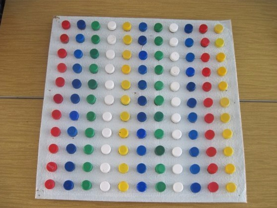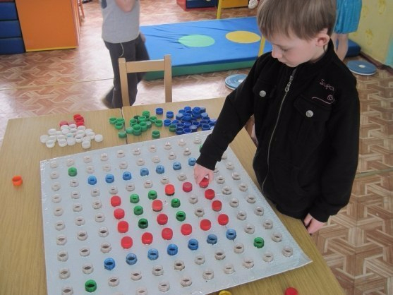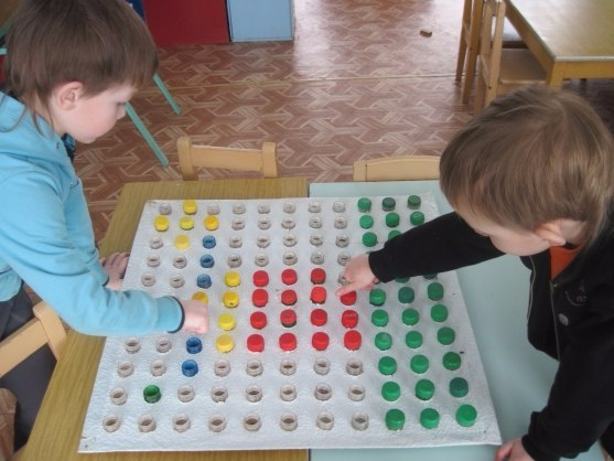Основа тренажёра изготовлена из толстого упаковочного картона, обклеена моющими обоями и прорезаны отверстия. В отверстия вставлены горлышки от пластиковых бутылок, подобраны пробки разных цветов.