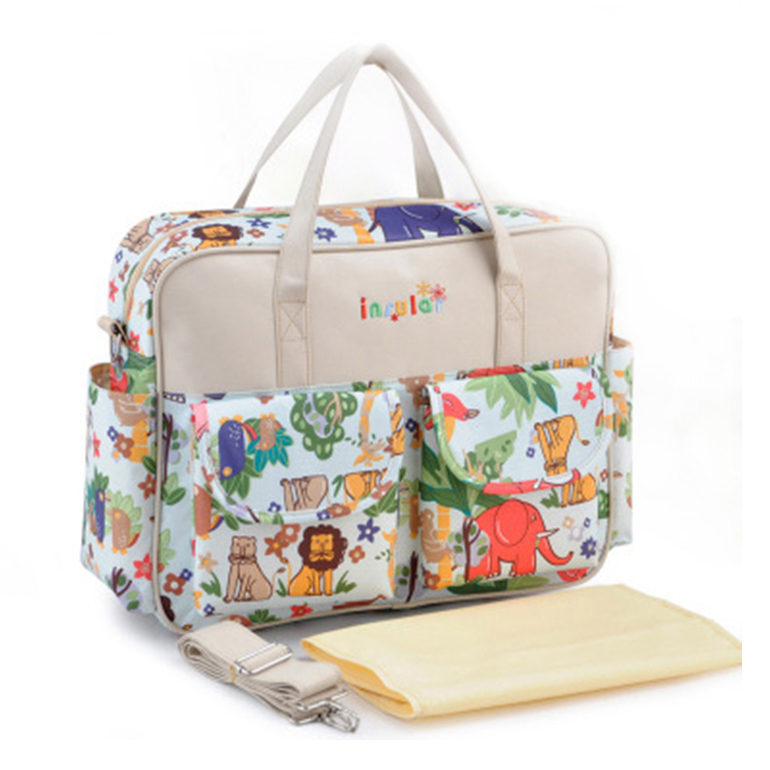 Сумку можно носить на плече, в руках или закрепить на коляске при помощи плечевого ремня. В центральном отделение 4 кармана: два на резинке, один на молнии. С лицевой стороны есть два накладных кармана на липучке и сзади один вместительный карман. В комплекте идет длинный плечевой ремень и пеленальный коврик.