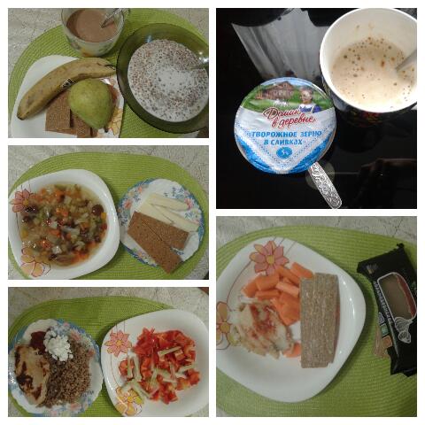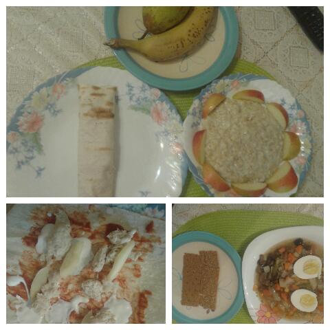Утро каша овсянная на молоке, яблоки, и лаваш с индейкой, сыроми томатной пастой + сметана. Перекус -банан и грушаОбед - суп грибной с яйцом и хлебцы.Ужин - креветки тушеные