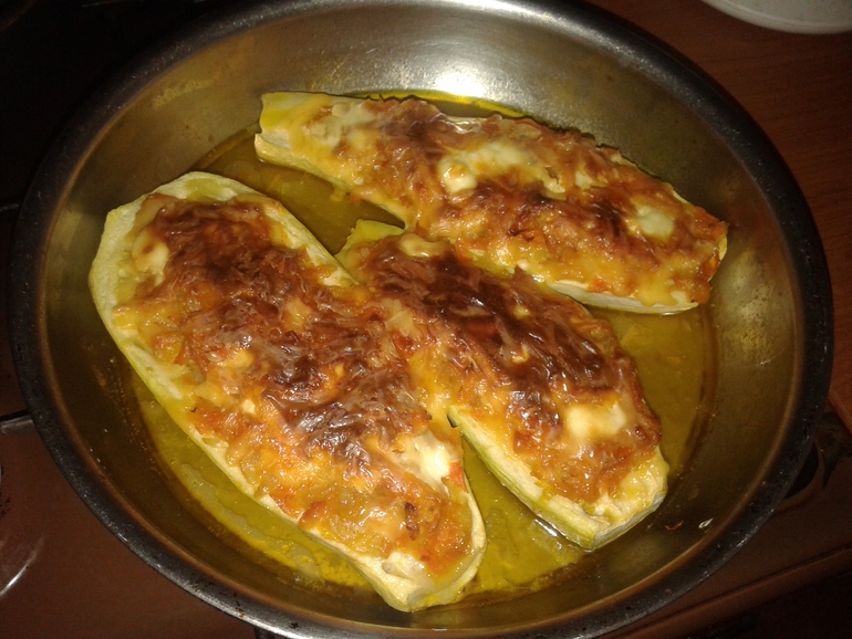 Начинка: тушеная тертая морковь с луком и измельченной сердцевиной кабачка. Соль, сухой чеснок. Сверху сыр нежирный, насыпала его уже через 30 минут начала приготовления. В сковороду также наливала воды, чтоб она кипела и уваривала сам кабачок.