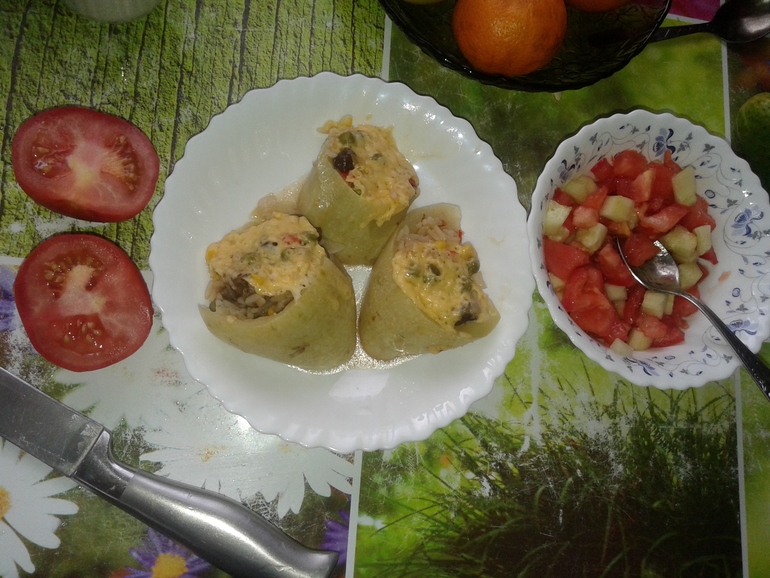 На варку риса не было времени, фарша тоже. В общем, что было, то и приготовили. Та-дам!