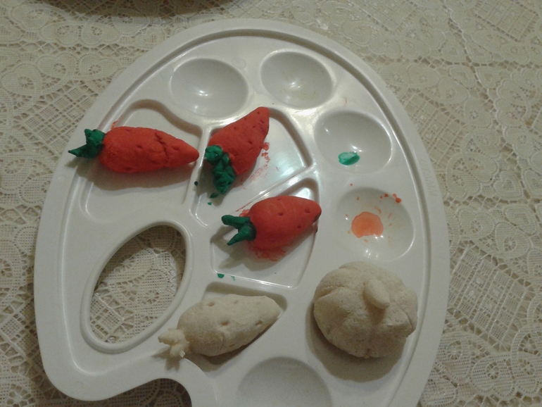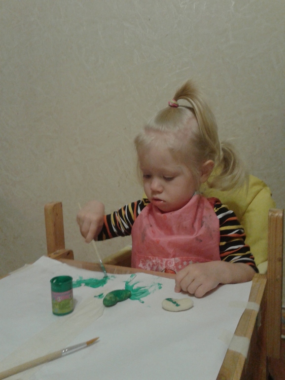 Теперь она хоть кисточкой водит. Понравилось ладошкой по листу бить, но со следами краски еще не разобралась. Из лепки нравится мять пластилин .