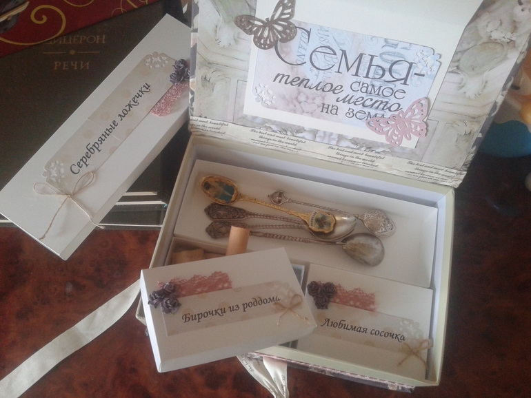Чудесная шкатулка с фамильными ценностями: бирочки мои, мужа, дочерей, ложечки серебряные (в том числе времен 1 мировой войны), и милые записки старшей дочери с несколькими рисунками.