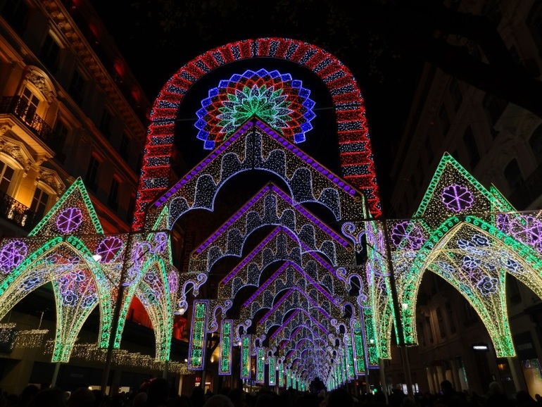 Итак, освящение статуи состоялось 8 декабря 1852 года, потом были назначены шумные празднества: фейерверки, бенгальские огни, фанфары на улицах... Увы, сразу после церемонии разразилась гроза, - празднества отменены, фанфары убраны, фейерверки свернуты. Печальные лионцы готовятся разойтись по домам, но тут -ура! -гроза стихает. Жители города на радостях самостоятельно разжигают огни на холме Фурвьер, выносят на улицы люминьоны - огни в плошках, мисках, украшают улицы и свои дома. Праздник Света родился!