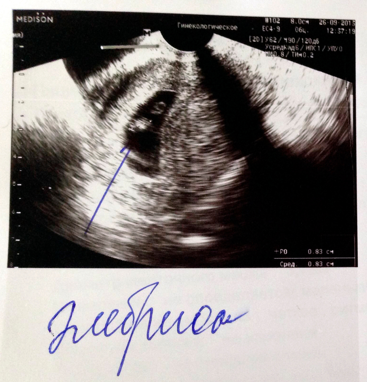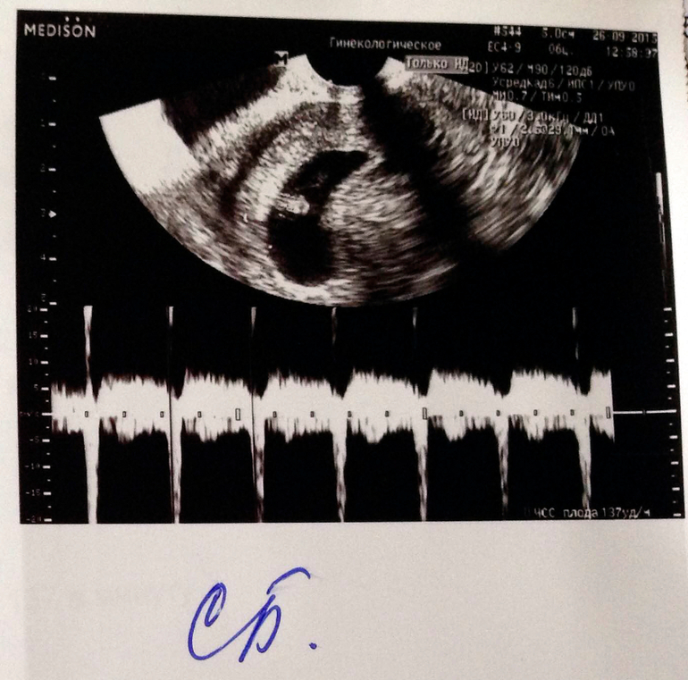 Вот и первые фото малыша :) Еще совсем маленький, 8,3 мм! Срок оказался еще меньше, чем я думала, всего 6 недель и 5-6 дней. Сердечко уже бьется, да так быстро - 137 ударов в минуту. Есть гипертонус передней стенки матки, назначили магний В6, буду успокаиваться. В следующий раз теперь только через месяц идти, 24 октября, будут делать скрининг на генетические патологии, а потом, если все хорошо, встану на учёт :)