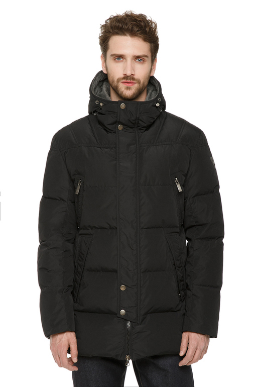 Мужская зимняя куртка, удлиненная, свободного прямого кроя с капюшоном. Центральная застежка - двухзамковая молния и наружная ветрозащитная планка на кнопки, переходящая в воротник-стойку. Объемный утепленный капюшон с затяжками на шнурках со шлевками, не отстегивается. Ширина изделия на талии регулируется кулиской на шнурках cо шлевками из кожи.