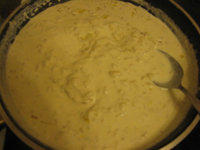 Не убирая с плиты порциями на медленном огне вводить сливки в лук, постоянно помешивая, добавить мускат, перец молотый и специи, соль,чеснок, пропущенный через пресс.