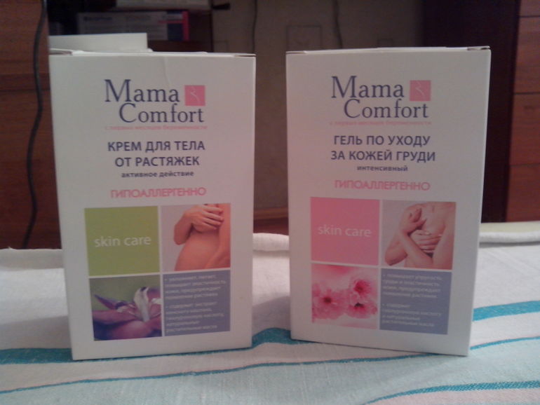 Я долго выбирала, читала, изучала, нюхала. И вот у меня на полочке поселились два новых друга. Крем для тела от растяжек и гель по уходу за кожей груди от MamaComfort. Что меня к ним привлекло, так это то что ими можно пользоваться с первых месяцев. Я пользуюсь ими уже 2 дня и пока меня все устраивает, об эффектах конечно рано говорить,)) но так как они наносятся, впитываются, не оставляют ощущения жирности и запах, он абсолютно нейтральный, мне нравится)