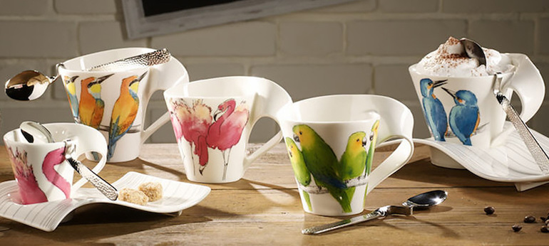 Компания «Villeroy & Boch» несколько веков занимается производством фарфоровой посуды. В 2015 году вышла новая серия кофейных чашек New Wave Animals of the World. Современный дизайн фарфоровых изделий получил награду Red Hot. Для истинных кофеманов чашки представлены в разных объемах. Для эспрессо, например, можно выбрать На ней изображена маленькая колибри. Цвета рисунка подобраны настолько превосходно, словно перенесены самой природой на этот предмет.