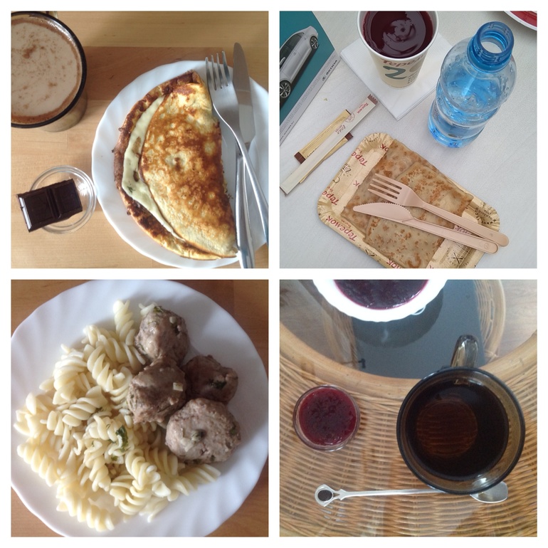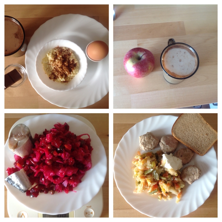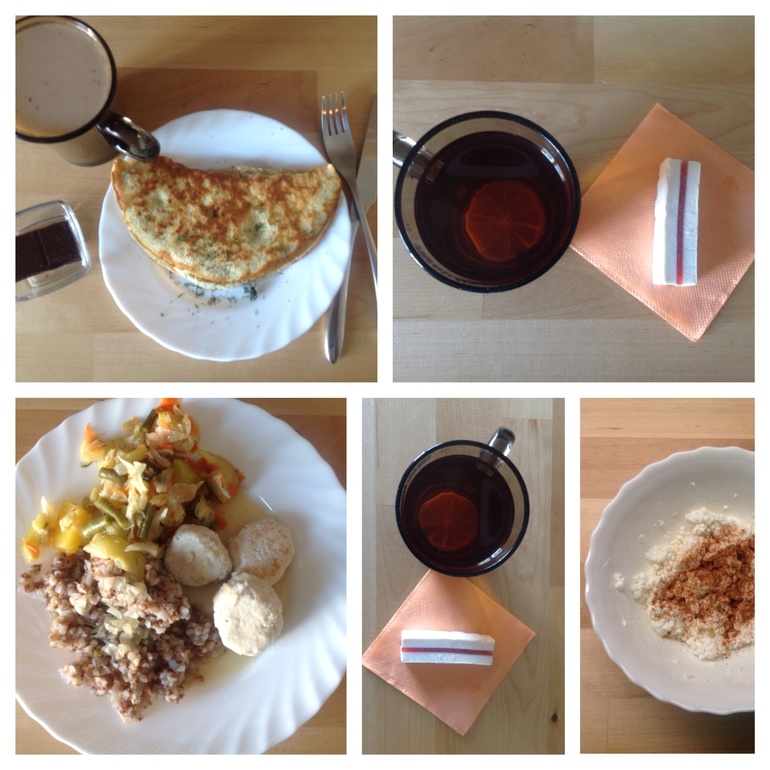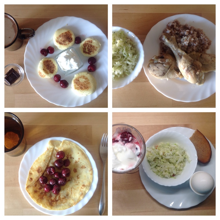 4. Яйцо всмятку, капустный салат, хлеб, мягкий творог с вишней и сахзамом