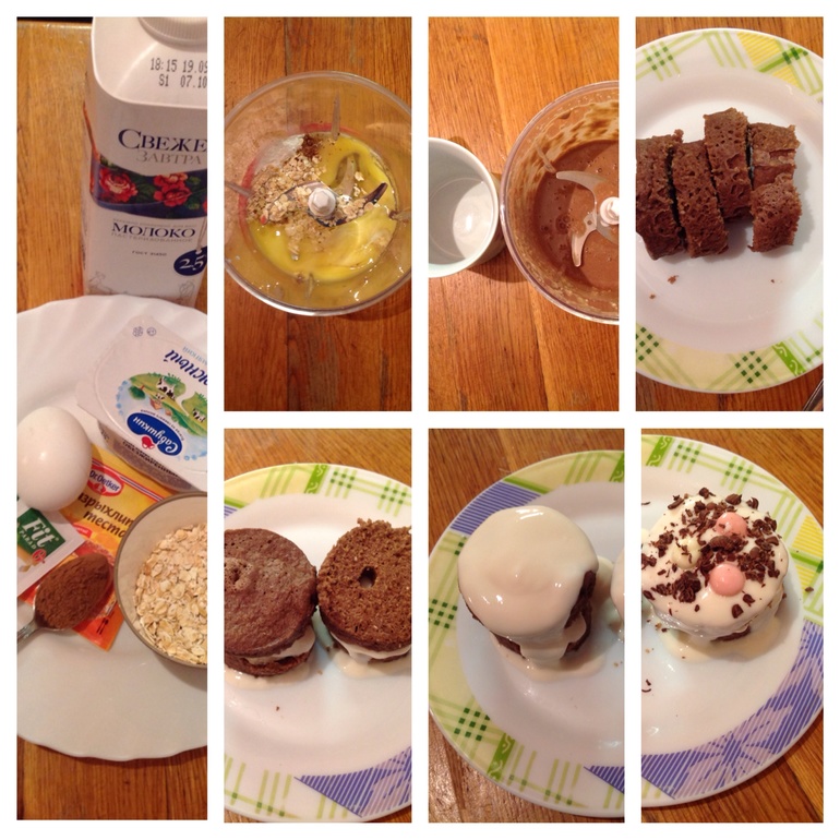 Ингредиенты: яйцо ~ 60 грамм, 3 ст.ложки овсяных хлопьев ~ 36 грамм, 3 ст.ложки молока 2,5% ~ 56 грамм, 1 ч.ложка какао ~ 9 грамм, 2 саше ФитПарада, 1/3 ч.ложки разрыхлителя. Для крема: мягкий творог 0% жирности ~100 грамм, 1-2 саше ФитПарада. Для украшения: 1 долька темного шоколада ~ 6 грамм.