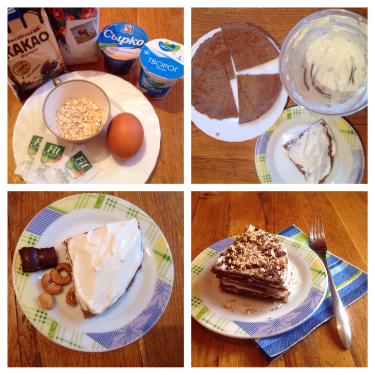 Приготовление: все ингредиенты для какао-овсяблина взбить в измельчителе, из полученного теста испечь два блинчика. Я делаю это одновременно на двух сковородах. Затем каждый блинчик разрезать на 4 части. Итого получится 8 кусочков примерно одинаковой формы и размера. Их нужно последовательно промазать кремом и уложить стопочкой. Для приготовления крема нужно смешать ФитПарад, мягкий творог и сливочный сыр, причем это легко сделать ложкой, не используя блендер. Тортик украсить тертым шоколадом и (или) молотыми орехами. Данный десерт должен пропитаться в холодильнике не менее часа.