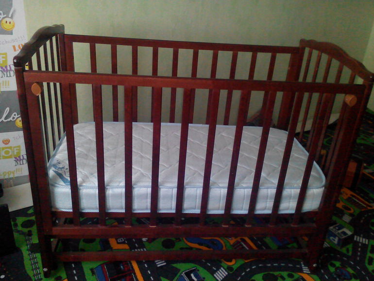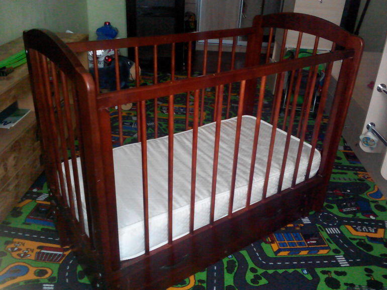 Регулируется борт и дно по высоте, 120х60, снизу вместительный ящик. Матрас со съёмным чехлом. Стоит в разобранном ввиде. Можгинский лесокомбинат.